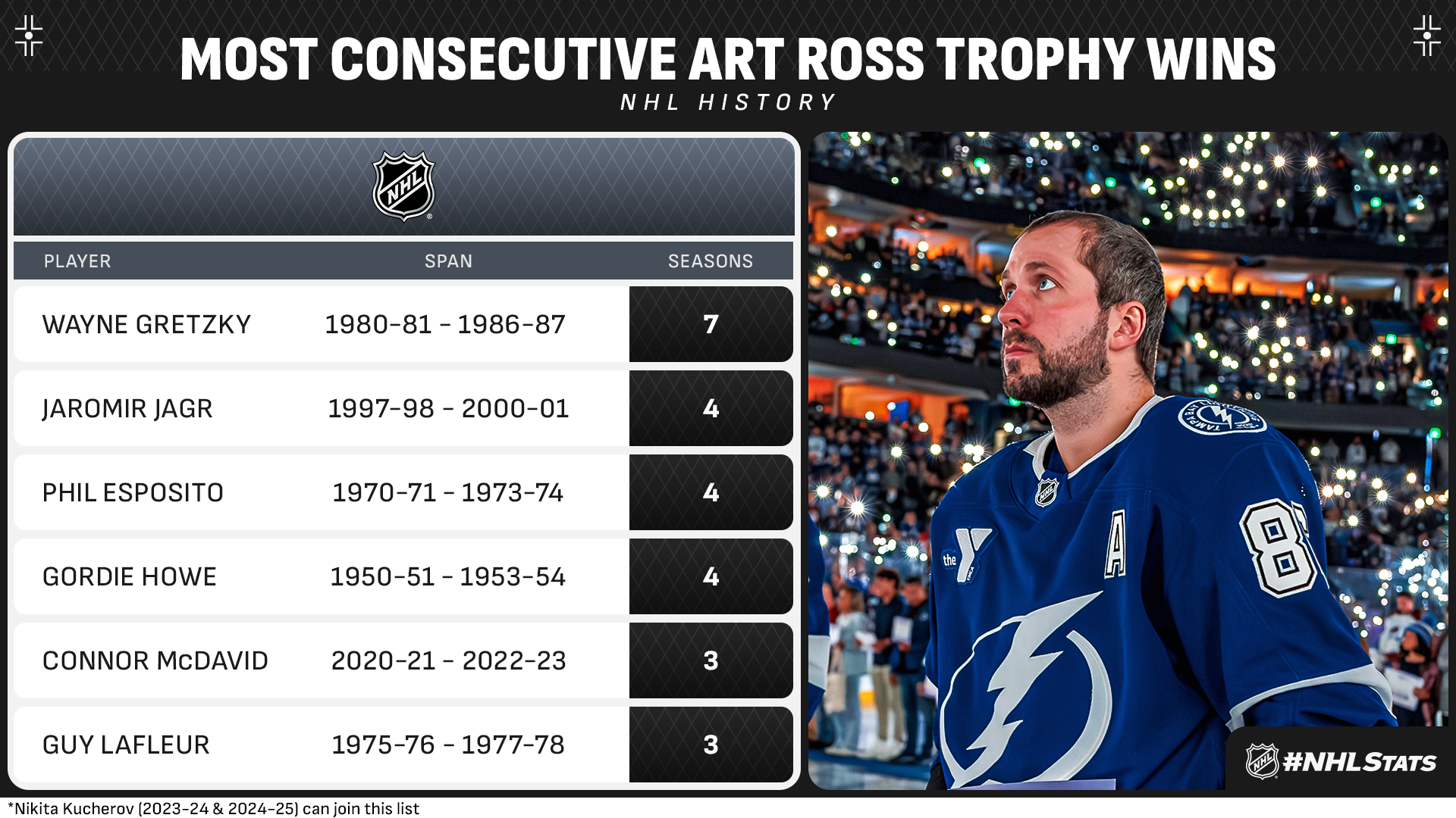 * Nathan MacKinnon has been in the mix with Kucherov for the Art Ross Trophy in each of the past two seasons after finishing just five points behind the Lightning forward in 2024-25. The Avalanche forward is in the midst of unprecedented home success during that span, having collected 20 more home points than the next-closest player and has only been held off the score sheet five times at Ball Arena during that stretch. MacKinnon, who posted a 35-game home point streak in 2023-24, enters 2025-26 with at least one point in each of his past 26 home games dating to Dec. 12, 2024 and can join Gretzky (49 GP & 41 GP) as just the second player in League history to post multiple home stretches of at least 30 games.
