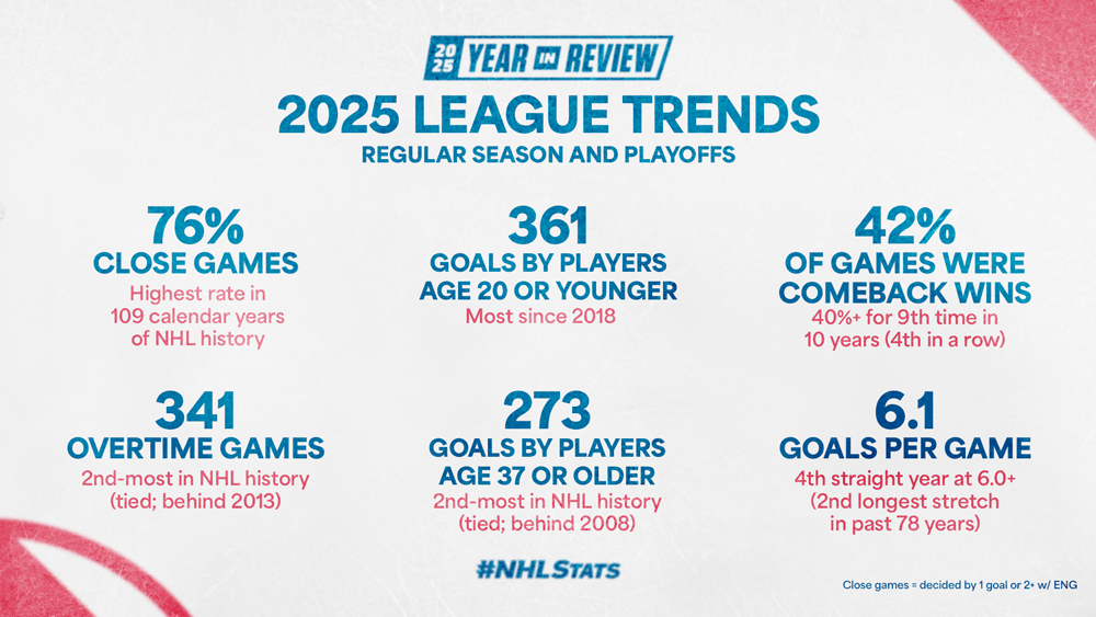 * Eleven players hit the 100-point milestone in 2025, marking the fourth straight calendar year with 10 or more skaters with 100-plus points (including playoffs) – a first since 1980 to 1993 (14 years).