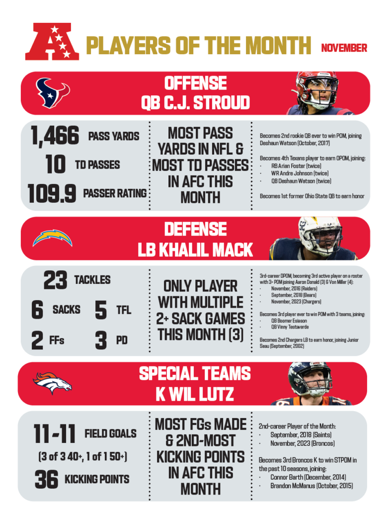 FootballNFL AFC Players & NFL Rookies of the Month – November By NFL Editor - November 30, 2023 0 110 FacebookTwitterPinterestWhatsAppLinkedinReddItEmailPrint