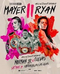 This rematch is expected to be another closely contested battle between two highly skilled fighters. Ryan’s physicality and pressure-fighting style will be tested against Mayer’s technical skills and adaptability. Ryan’s ability to cut off the ring and land powerful combinations could give her an edge in exchanges, especially if she can trap Mayer on the ropes.