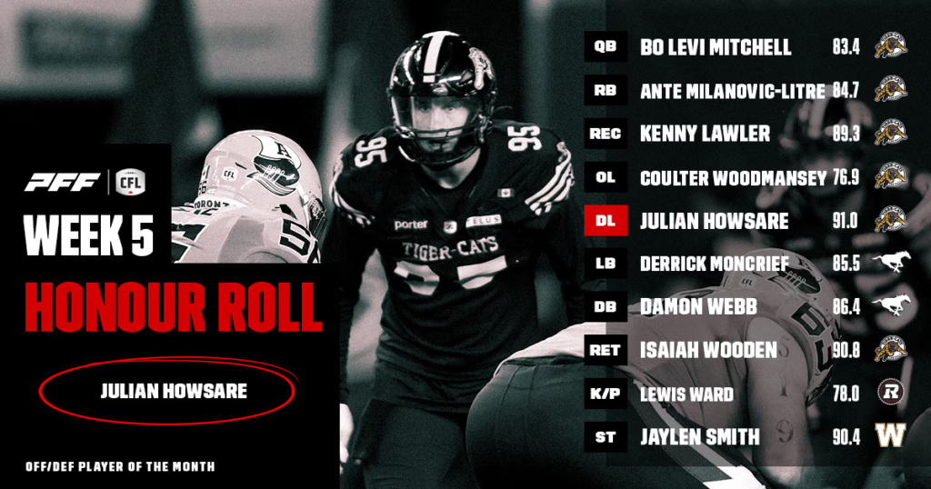 TORONTO – Julian Howsare, Kenny Lawler and the Hamilton Tiger Cats’ offensive line have made the grade for Week 5 in the Canadian Football League (CFL) Honour Roll powered by Pro Football Focus (PFF).
