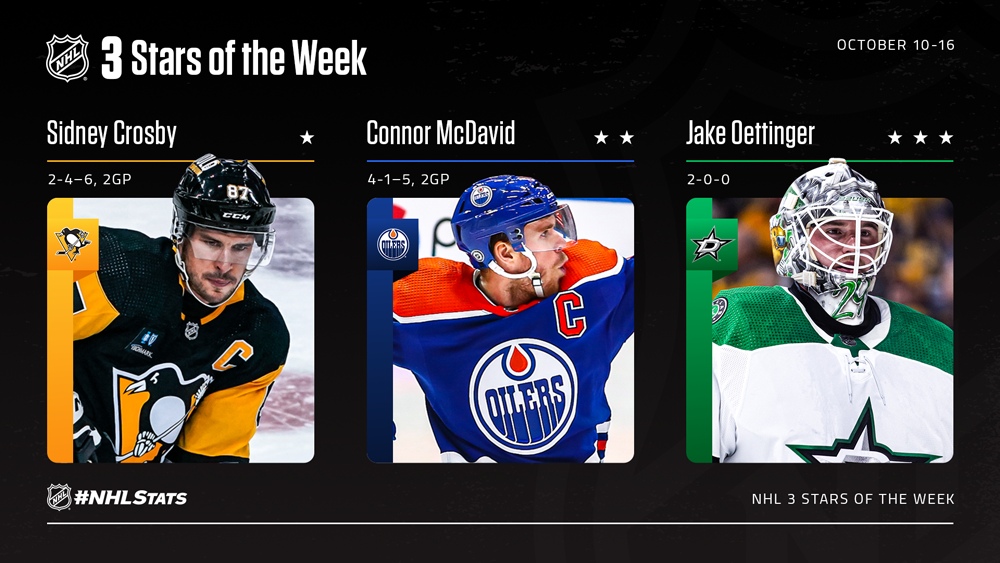 NEW YORK – Pittsburgh Penguins center Sidney Crosby, Edmonton Oilers center Connor McDavid and Dallas Stars goaltender Jake Oettinger have been named the NHL’s “Three Stars” for the week ending Oct. 16.