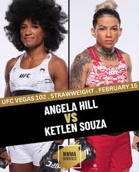 UFC Fight Night: Cannonier vs. Rodrigues Date: February 15, 2025 Venue: UFC APEX, Las Vegas, Nevada Division: Flyweight Rankings: #8 Ketlen Souza vs #10 Angela Hill