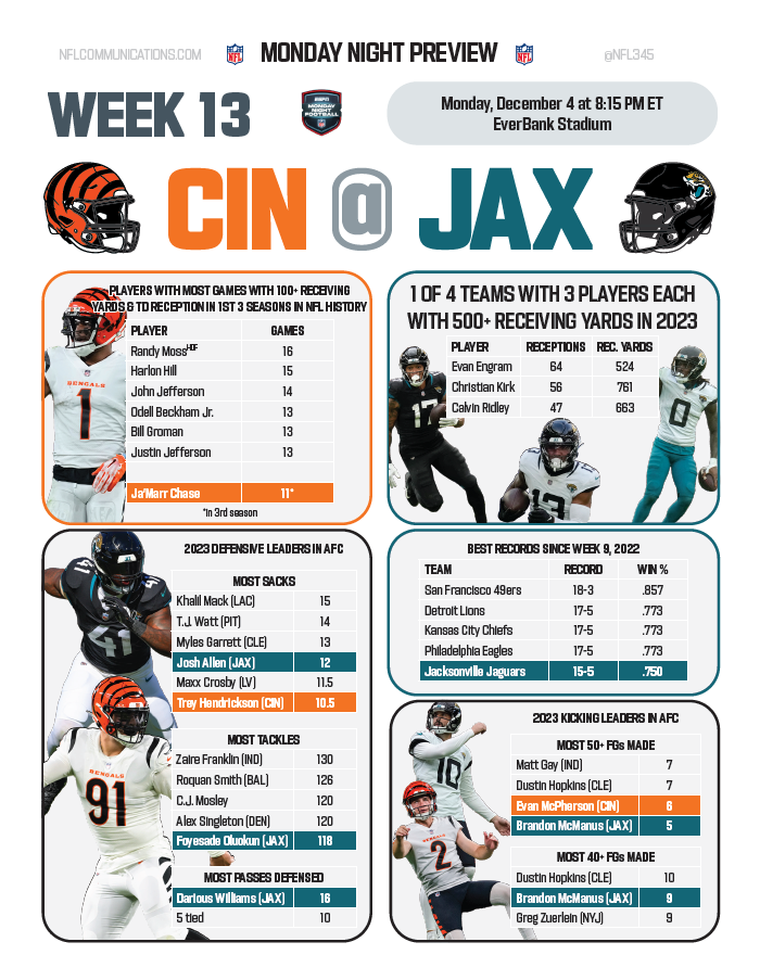 FootballNFL Monday Night Preview – Cincinnati Bengals at Jacksonville Jaguars By NFL Editor - December 4, 2023 0 106 FacebookTwitterPinterestWhatsAppLinkedinReddItEmailPrint