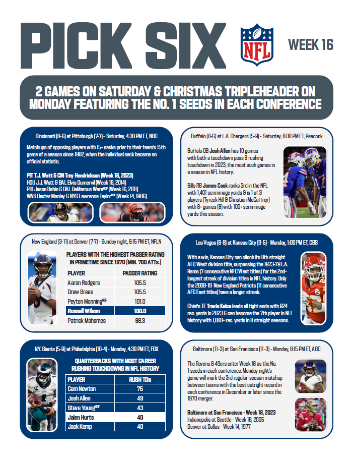 FootballNFL NFL Pick Six: Week 16 By NFL Editor - December 21, 2023 0 94 FacebookTwitterPinterestWhatsAppLinkedinReddItEmailPrint
