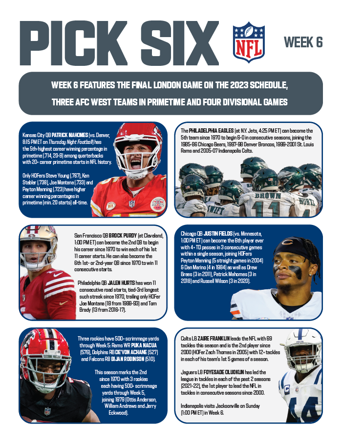 FootballNFL NFL Pick Six – Week 6 By NFL Editor - October 14, 2023 0 175 FacebookTwitterPinterestWhatsAppLinkedinReddItEmailPrint