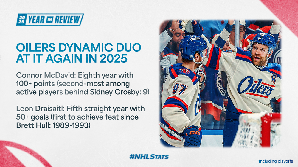 * Seven players have hit the 100-point milestone in 2025, with 10 others within 10 points of triple digits entering the final 15 days of the year. It could mark the fourth straight calendar year with 10 or more skaters with 100-plus points (including playoffs) – a first since 1980 to 1993 (14 years).