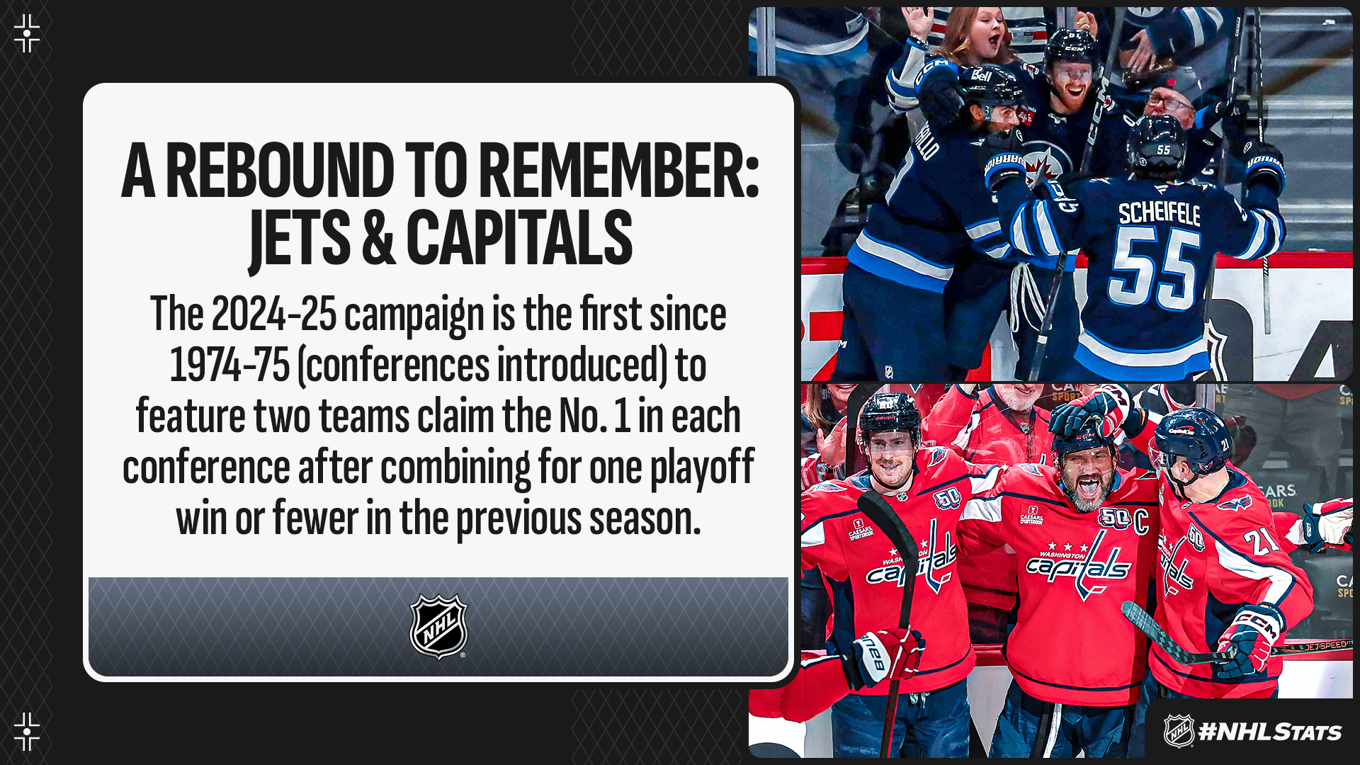 * The Jets and Capitals proved that a lot can change in a year, as they finished as the No. 1 seed in their respective conference after combining for one playoff win the year prior – a first-of-its-kind featIn-season turnarounds also were a story in April as the Blues and Canadiens overcame large standings deficits to secure playoff spots. Both clubs clinched in game No. 82, as did the Wild, making 2024-25 the first season under the 16-team playoff bracket in which three teams clinched a playoff spot in their last game.