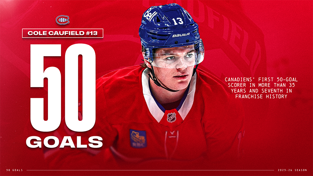 * Cole Caufield collected his first career 50-goal season to stay within two of Nathan MacKinnon (52) in the Maurice “Rocket” Richard Trophy race and Juraj Slafkovský scored the winner with 1:04 remaining in regulation as the Canadiens leapfrogged the Lightning (48-25-6, 102 points) for second place in the Atlantic Division. Caufield became the seventh different 50-goal scorer in franchise history and first since Stephane Richer (51 in 1989-90).