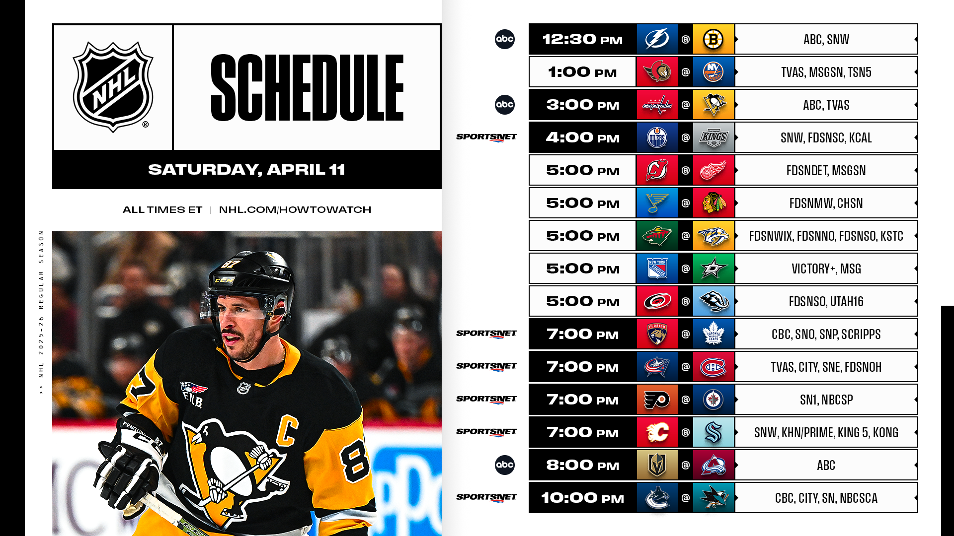 * There are no games scheduled today but 30 teams will be in action for the final 15-game day of the season tomorrow, including the Penguins and Capitals who open their back-to-back set during an ABC Hockey Saturday matinee. The contests will mark the 100th and 101st head-to-head games (including playoffs) between Crosby and Alex Ovechkin.