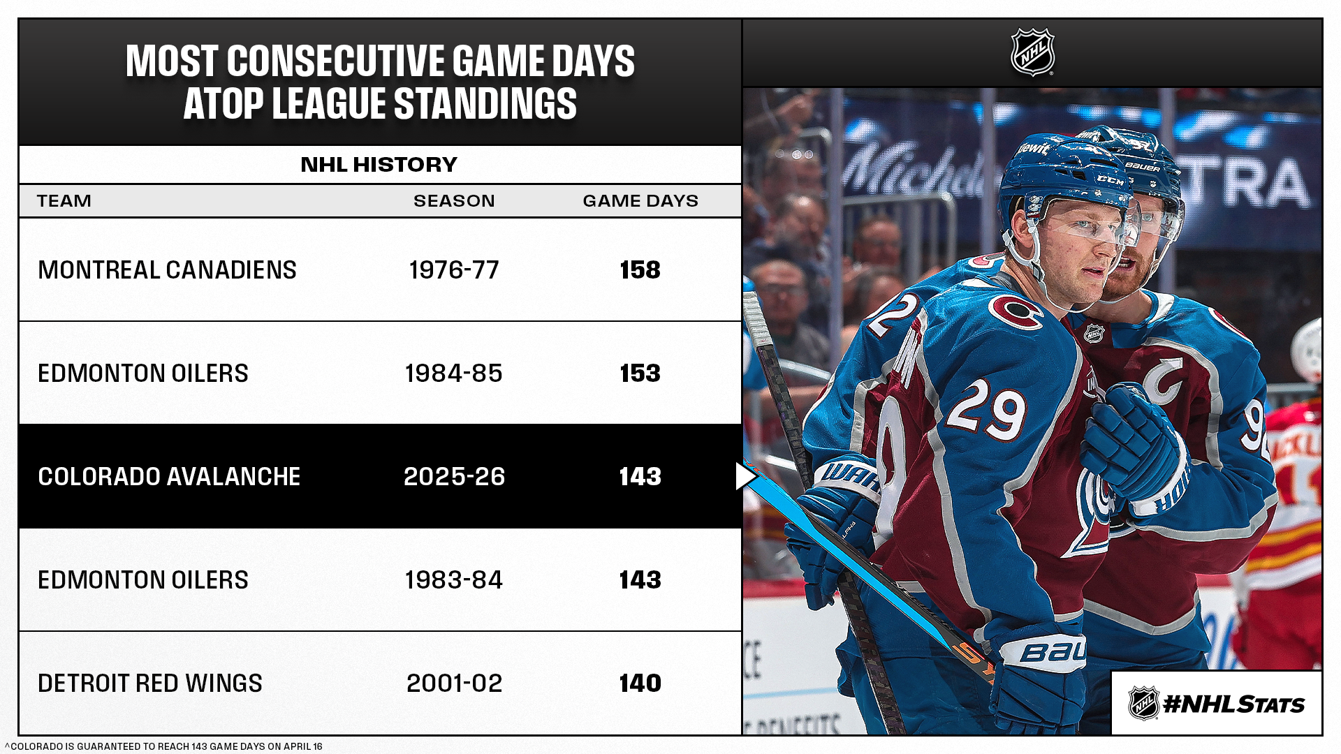 * Nathan MacKinnon posted his League-leading 20th three-point game of 2025-26 as the Avalanche clinched their fourth Presidents’ Trophy in franchise history – and second in the past six seasons.