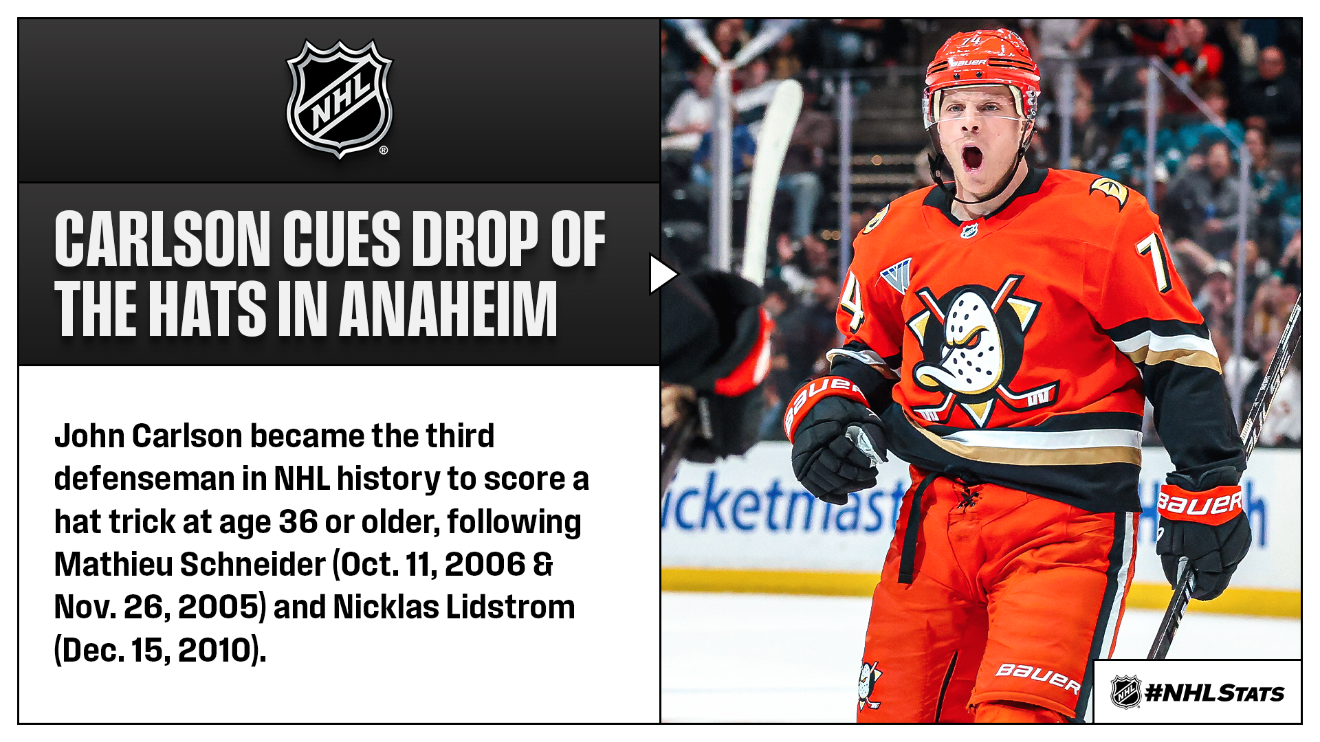 * Carlson became the fourth defenseman in Ducks history to score a hat trick, joining Cam Fowler (Nov. 4, 2018), Hampus Lindholm (Dec. 21, 2017) and Lubomir Visnovsky (March 4, 2011). Carlson tallied his first career hat trick in his 1,156th career contest – Nicklas Lidstrom (1,442 GP) is the only blueliner in NHL history to have played more games prior to his first three-goal outing.
