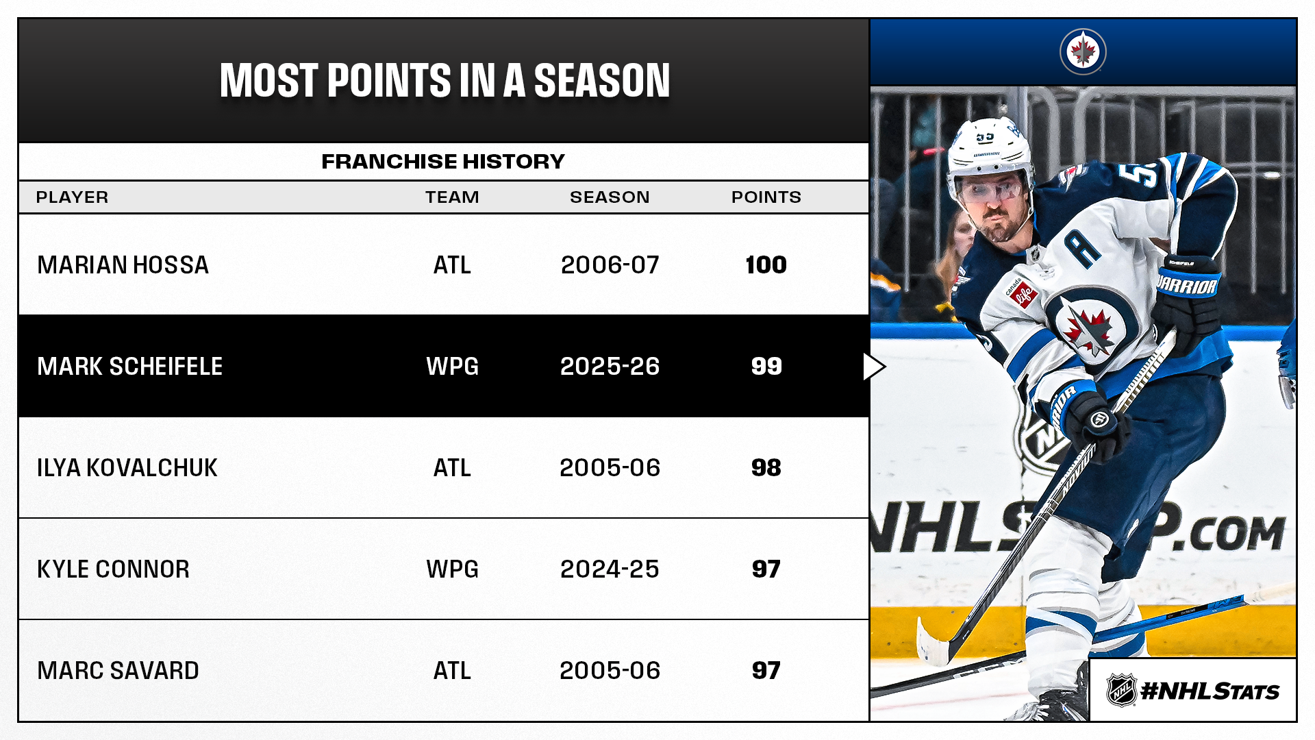 * Mark Scheifele (0-2—2) assisted on two of his team’s three goals as the Jets (35-31-12, 82 points) kept pace with the Kings. Winnipeg (28) owns the second most regulation wins among all teams in the Wild Card race, behind St. Louis (29). Scheifele’s multi-assist outing tied the franchise record for most in a single season (also Marc Savard: 21 in 2005-06) and moved within one point of becoming the franchise’s second 100-point scorer.