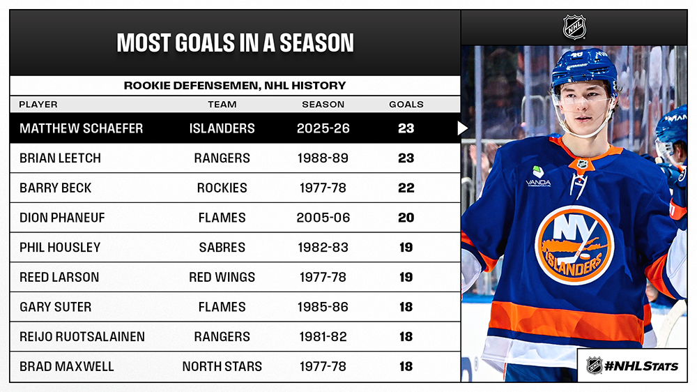 * Matthew Schaefer scored his 23rd goal on the campaign to tie Brian Leetch (23 in 1988-89) for the highest single-season total by a rookie defenseman in NHL history and help the Islanders defeat his hometown team during Peter DeBoer’s head coaching debut. New York (43-31-5, 91 points) moved within one point of Philadelphia (40-27-12, 92 points), which occupies third place in the Metropolitan Division.