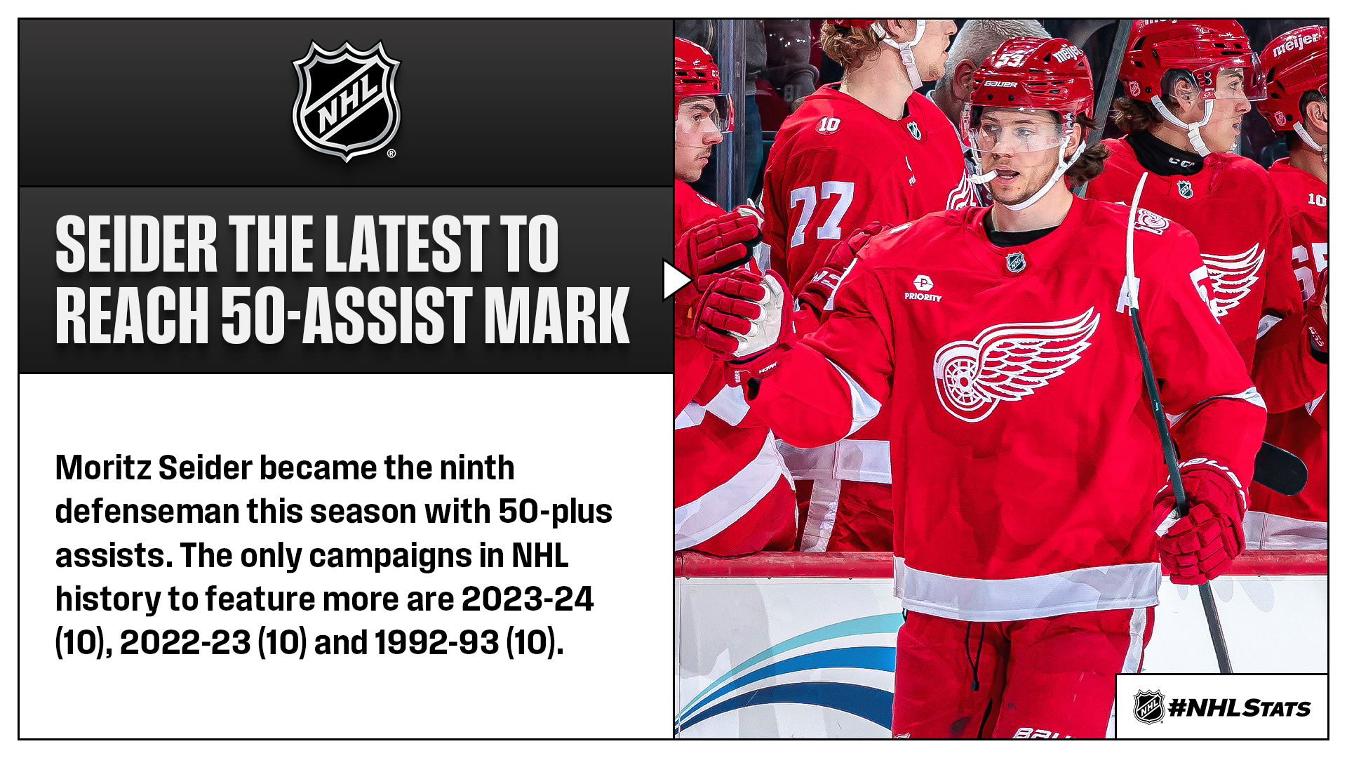 * Seider’s fourth assist of the game was his 50th of 2025-26 as he became the first Detroit defenseman since Nicklas Lidstrom (60 in 2007-08) to reach the mark in a campaign. It also marked his second career four-assist outing, a feat only three other blueliners have achieved for the franchise: Paul Coffey (2), Reed Larson (2) and Lidstrom (2).