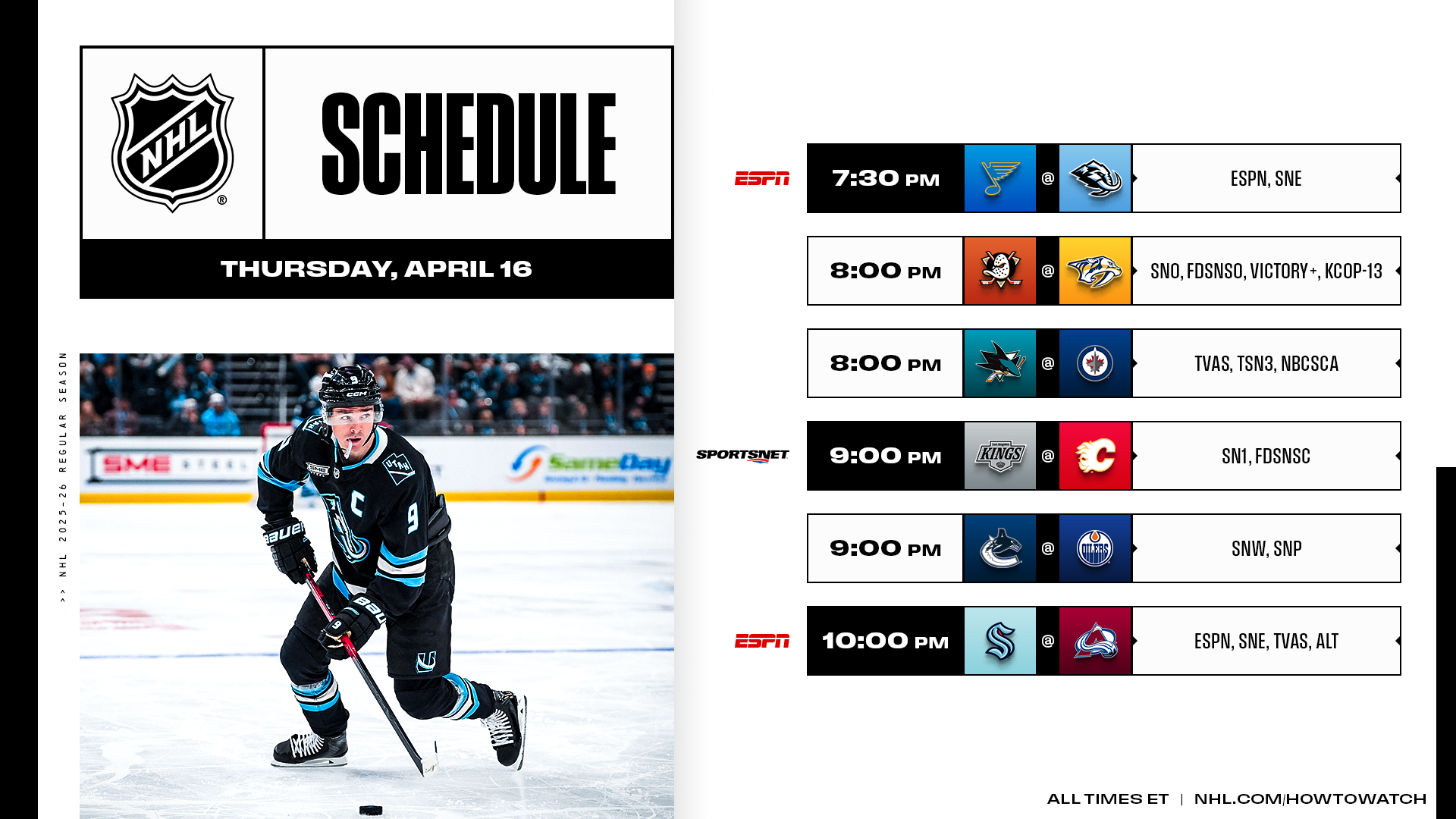 The final day of the 2025-26 regular season sees all eyes fixed on the Pacific Division, where positioning and First Round matchups will be finalized for the 2026 Stanley Cup Playoffs which begin this Saturday. The all-Western Conference six-game slate will also feature an ESPN doubleheader that opens with the Mammoth battling the Blues in their final game before their postseason debut and closes with the Presidents’ Trophy-winning Avalanche going head-to-head with the Kraken.