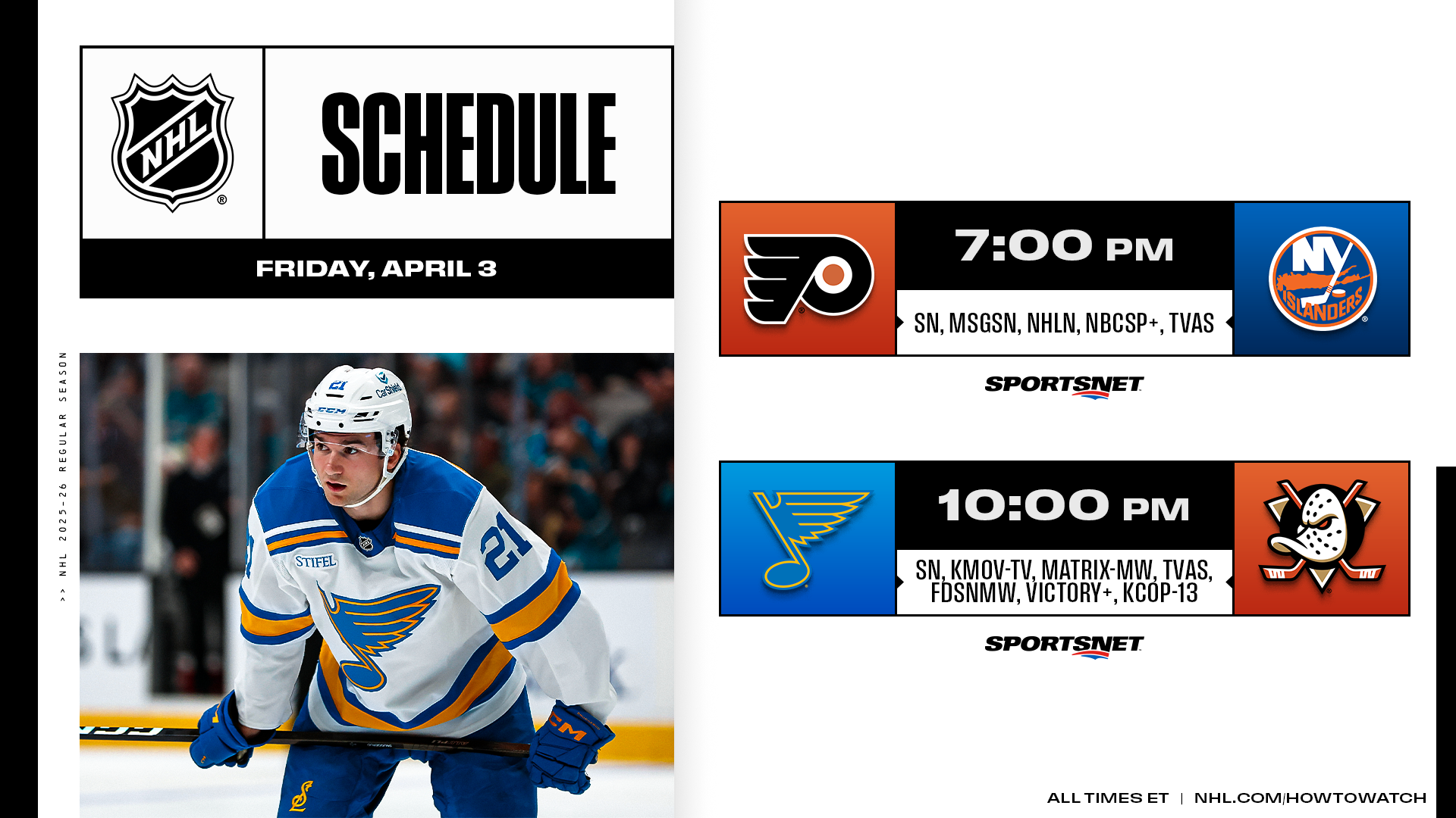* A Sportsnet doubleheader features a pair of pivotal matchups as the Flyers continue to chase a Wild Card position in the East when they face the Islanders and the Blues look to inch closer to a playoff position when they clash with the Ducks.
