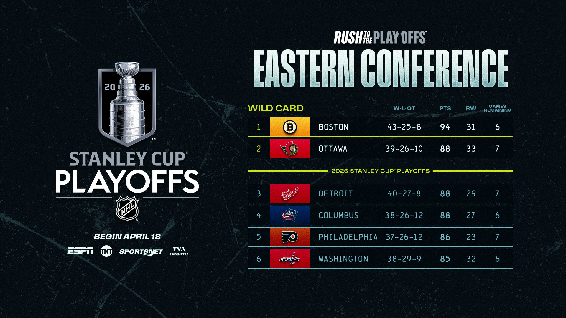 * Wild Card and divisional races in the Atlantic and Pacific continued to heat up as teams look to secure the 12 remaining spots in the 2026 Stanley Cup Playoffs
