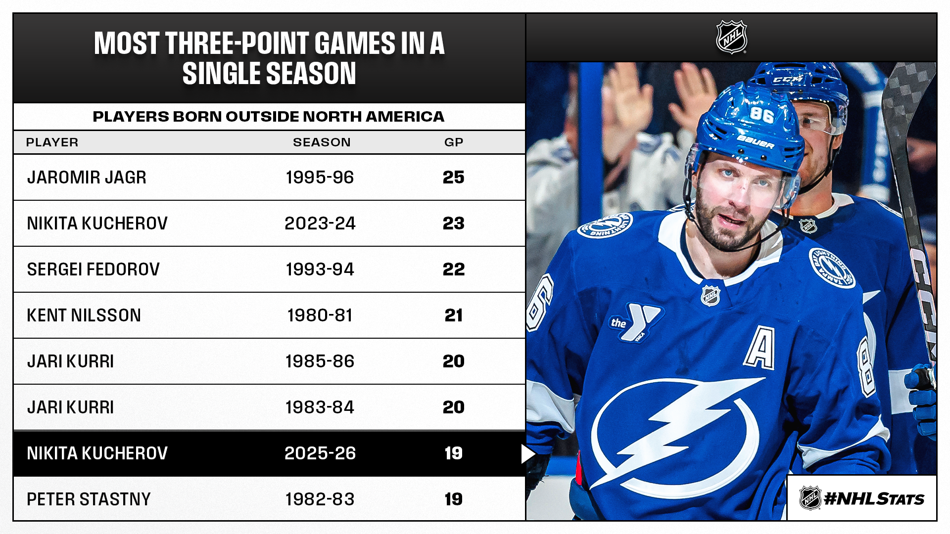 * Kaprizov reached the 40-goal mark for the fourth time in his career and tied Nikita Kucherov for the third most by an active player born outside North America. He now trails only Alex Ovechkin (14) and Leon Draisaitl (6).