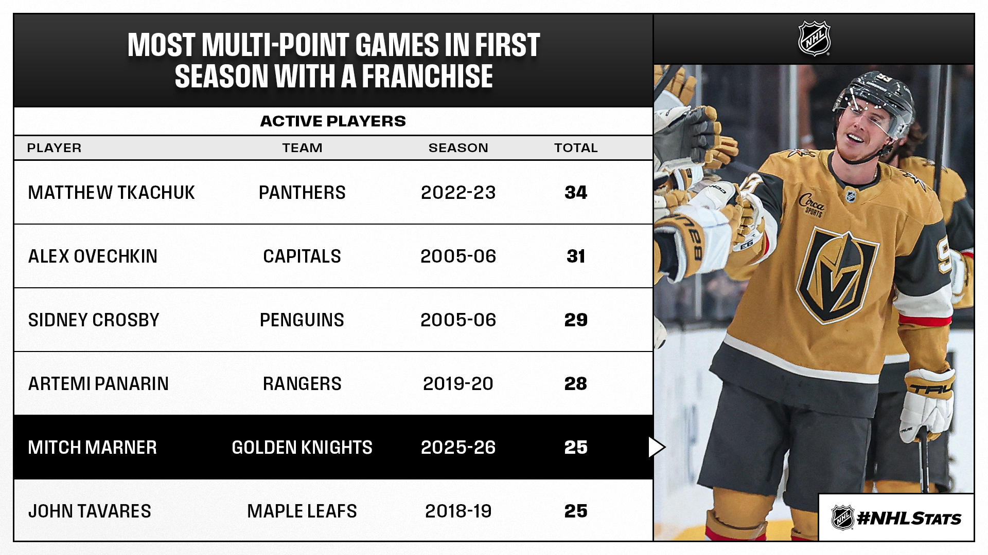 * Marner’s five-point night started with two goals – his 25th multi-point game of the season – and ended with him becoming the 10th player in Golden Knights history with a hat trick. The forward boosted his 2025-26 totals to 23-53—76 and passed Jonathan Marchessault (75 in 2017-18) for the second-most points by a skater in their first season with Vegas, behind only William Karlsson (78 in 2017-18).