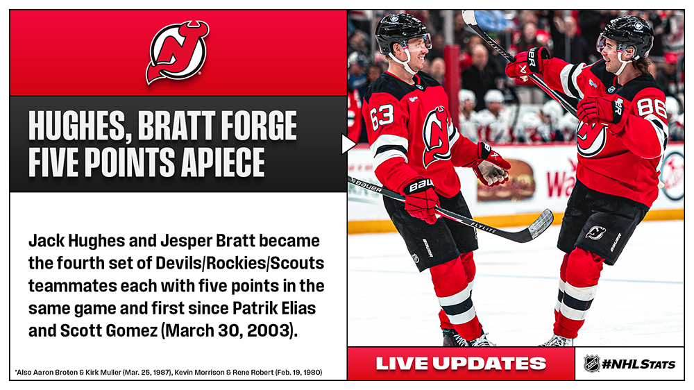 Thursday’s edition of #NHLStats: Live Updates featured more notes from the 14-game slate, including Jack Hughes (2-3—5) and Jesper Bratt (1-4—5) becoming the first Devils teammates in more than 23 years to each record five points during the same contest.