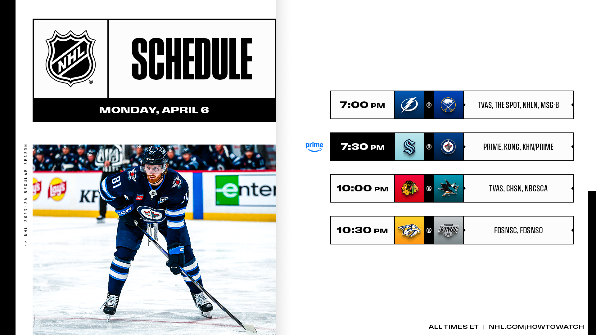The battle for Wild Card 2 in the West will be central to three of four games tonight, including Prime Monday Night Hockey clash between the Kraken and Jets. Elsewhere, the Predators and Kings clash for the second time in five days – with Nashville looking to claim a third straight win against a team in the thick of the race (Thursday at LAK, Saturday at SJS) – while Macklin Celebrini looks to propel his Sharks closer and inch toward a franchise scoring record when they host Connor Bedard and the Blackhawks. Check out the April 6 edition of #NHLStats Live Updates for notes on each Western Conference clash.
