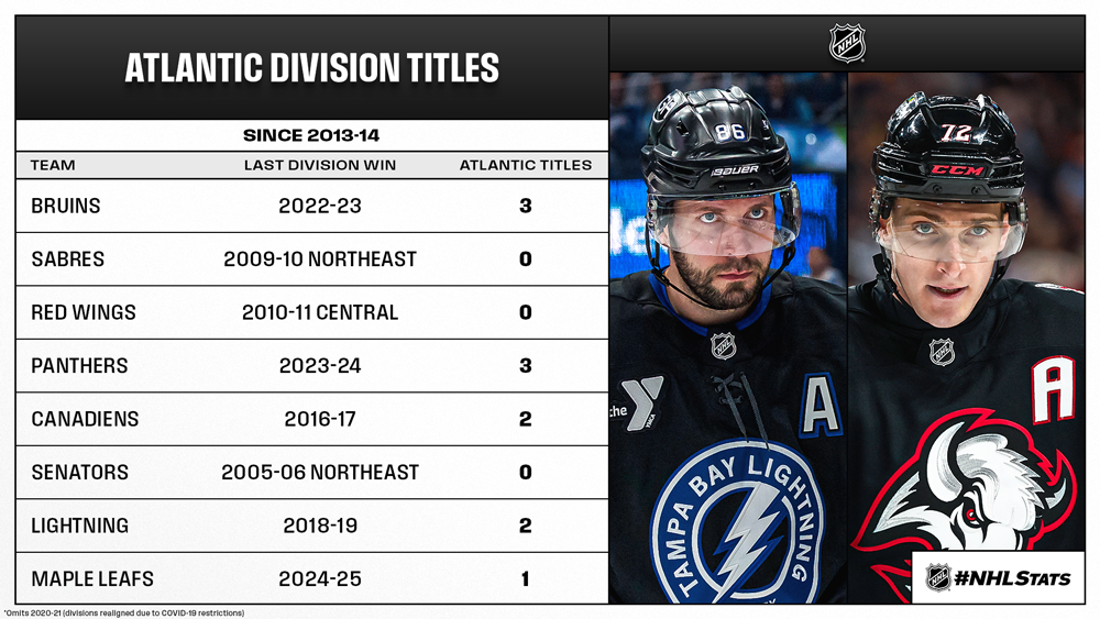 * Less than one month after playing one of the most memorable games of the season – a 15-goal thriller on March 8 – the Sabres and Lightning are officially heading to the Stanley Cup Playoffs and could meet in the First Round, though both have sights set on the No. 1 seed in the Atlantic Division. Some combination of Boston, Florida, Tampa Bay and Toronto has finished top-three in the Atlantic Division for seven consecutive seasons (2017-18 to 2024-25; omits 2020-21 for COVID-19 realignment), but that will change in 2025-26. The current top three is separated by two points, with Buffalo seeking its first division title since 2009-10 (Northeast), while Tampa Bay and Montreal can both claim their third under the current division format.