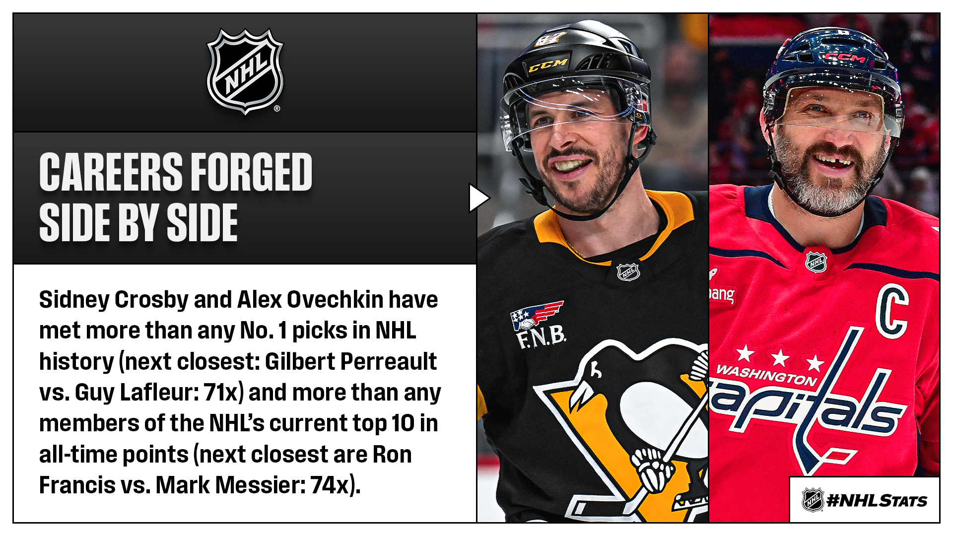 5. Sid vs. Ovi 101 (Saturday on ESPN, Sunday on TNT): The final weekend of the 2025-26 regular season is scheduled to include both the 100th and 101st all-time meetings between Sidney Crosby (48-79—127; 56-39-4 record) and Alex Ovechkin (53-50—103; 43-46-10 record). More than 20 years after their first-ever meeting (Nov. 22, 2005 at Mellon Arena), the two have combined for 1,730 goals, 2,061 assists, 3,791 points, 11 Maurice “Rocket” Richard Trophies, five Hart Trophies, four Stanley Cups, three Art Ross Trophies and three Conn Smythe Trophies.