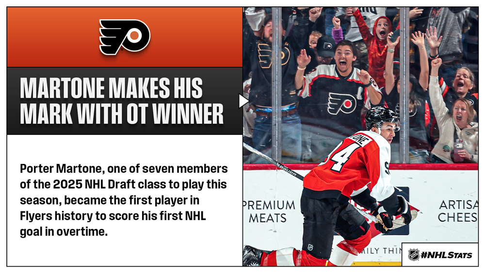 * Facing the Bruins, owners of Wild Card 1 since March 17, the Flyers secured a point to displace the idle Islanders for the No. 3 seed in the Metropolitan Division but 19-year-old rookie Porter Martone did them one better by securing the victory in overtime with his first NHL goal. Philadelphia holds a playoff spot for the first time since Jan. 12, while Martone now stands as the second-youngest player in NHL history to score his first NHL goal in overtime.