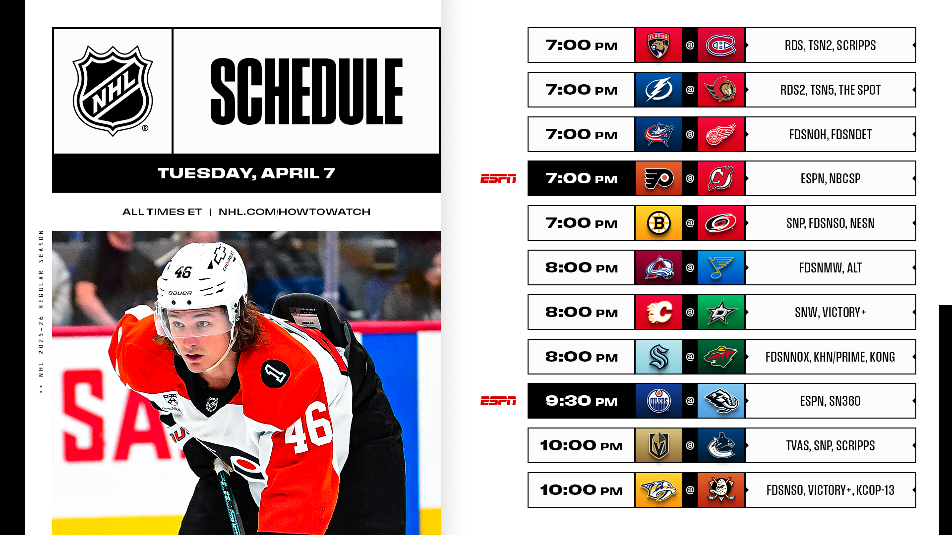 An ESPN doubleheader featuring the Flyers and Devils as well as the Oilers and Mammoth headlines a Tuesday docket that will have plenty of implications on an Eastern Conference postseason race that could see more clarity following the 11-game slate.