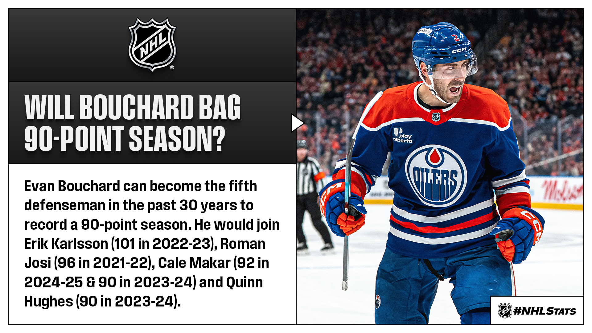 * Edmonton (P1) and Utah (WC1) clash in what could be a First Round preview should both teams enter the postseason in their current positions. Evan Bouchard and the Oilers still seek to clinch a playoff spot and the club’s first division title in nearly 40 years (last: 1986-87). Bouchard (21-67—88) is on the cusp of becoming the second defenseman in Oilers history to post a 90-point season (Paul Coffey: 5x).