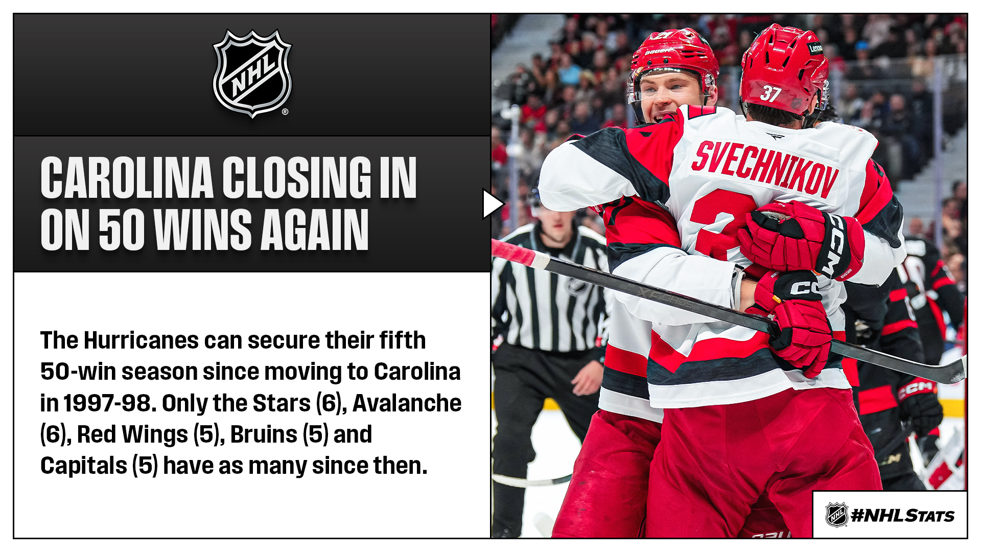 * Teams higher in the standings will also have opportunities to clinch division crowns in the form of Colorado (Central Division & Western Conference) and Carolina (Metropolitan Division). Should the Avalanche secure their first-place finish, it would also lock in a First Round matchup between the Stars and Wild. The Hurricanes (49-22-6, 104 points) also eye hitting the 50-win mark for the fourth time in five seasons, which would tie the Avalanche for the most among all teams since 2021-22.