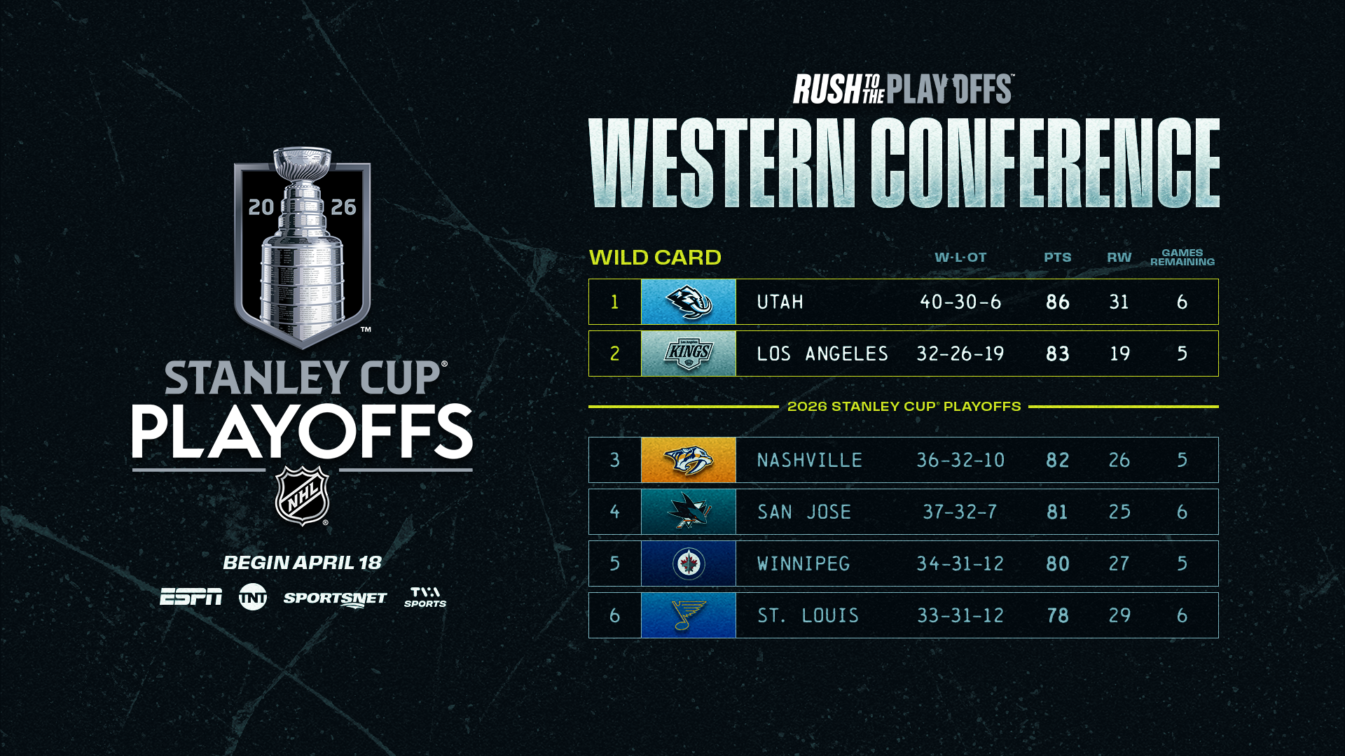 The Kings (32-26-19, 83 points) came out victorious in the battle for Wild Card 2 in the West, defeating the Predators (36-31-10, 82 points) to move back into a playoff spot, while the Sharks (37-32-7, 81 points) and Jets (34-31-12, 80 points) won to stay within two and three points, respectively, of the playoff line.