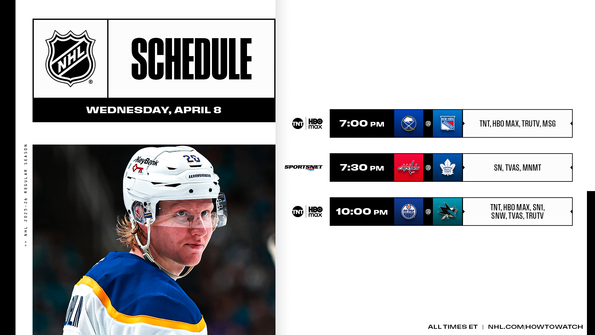 A three-game Wednesday features an NHL on TNT doubleheader beginning with the playoff-bound Sabres facing the Rangers before the Oilers and Sharks face off in a Pacific Division clash with both teams still looking to clinch a berth into the 2026 Stanley Cup Playoffs. Fans in Canada will also have a national broadcast when the Capitals and Maple Leafs battle on Sportsnet and TVA Sports.