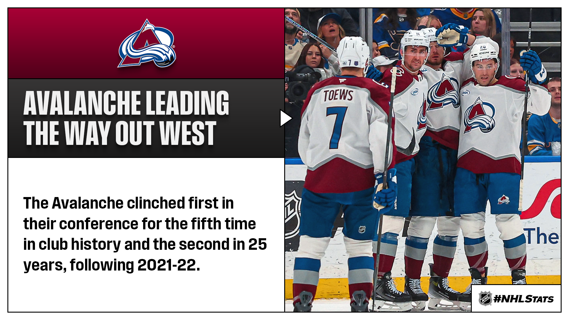 The Avalanche (51-16-10, 112 points) clinched the Central Division and Western Conference title by virtue of defeating the Blues in any fashion shortly after the Hurricanes (50-22-6, 106 points) defeated the Bruins to secure the No. 1 seed in the Metropolitan Division. Colorado and Carolina are the only two teams to have spent 100% of game days in a playoff position this season.