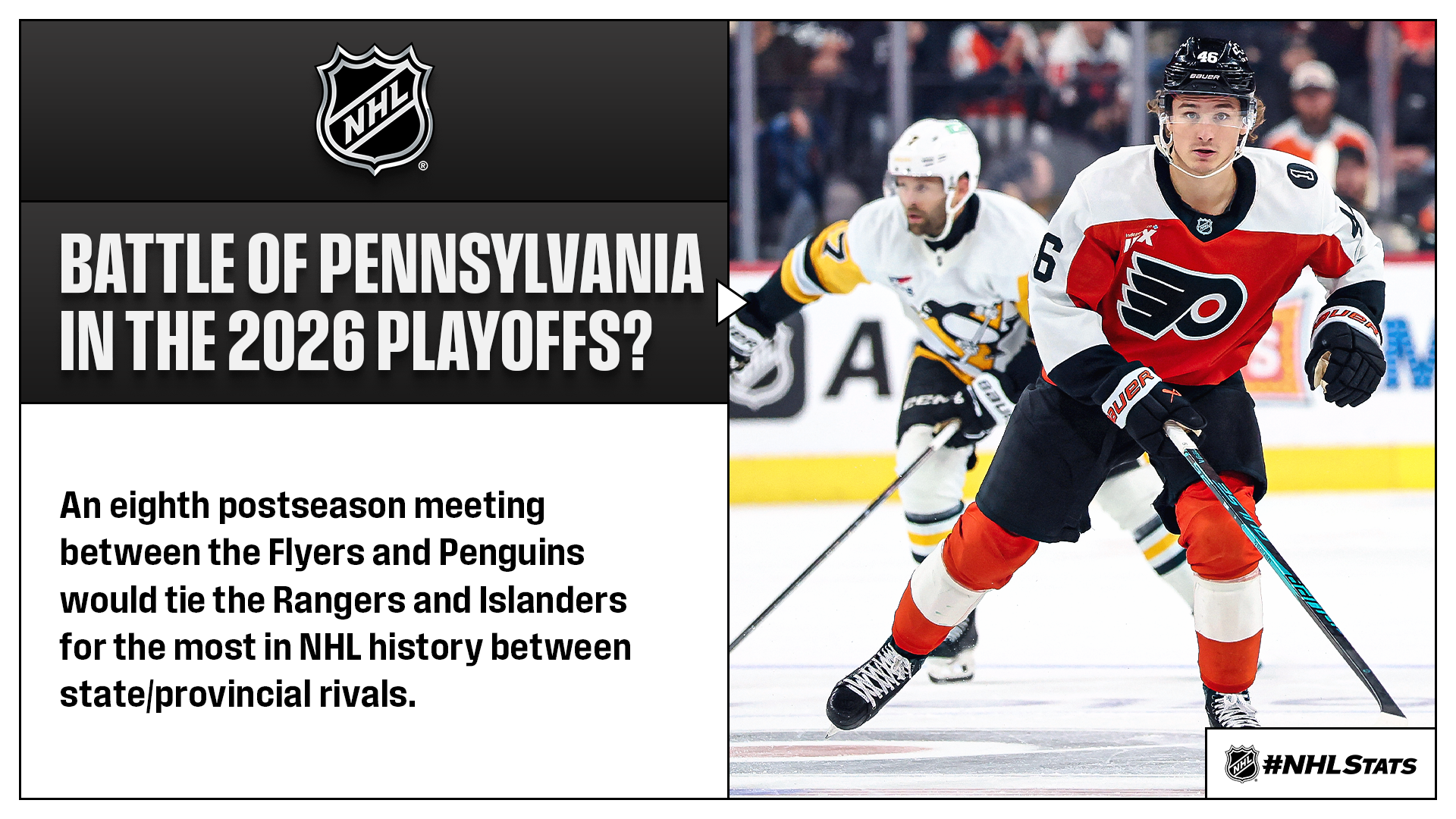 * The Flyers and Penguins would meet in the First Round if the Stanley Cup Playoffs started today. It would mark their eighth all-time postseason meeting and first since the 2018 First Round. That series concluded with a Penguins win in Game 6 that featured the first playoff contest in NHL history with opposing players each posting five or more points (Jake Guentzel: 4-1—5 & Sean Couturier: 3-2—5).