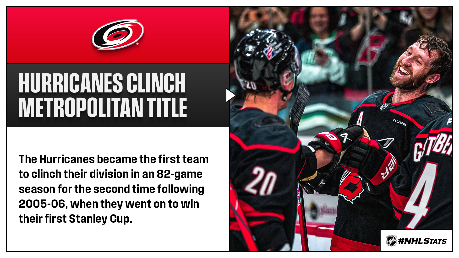 * The Hurricanes, who have held first place in the Metropolitan Division for 118 game days in 2025-26, won their division for the eighth time in franchise history and third since Rod Brind’Amour took over as head coach in 2018-19, tied with the Capitals for the most among all Metropolitan teams during that span.