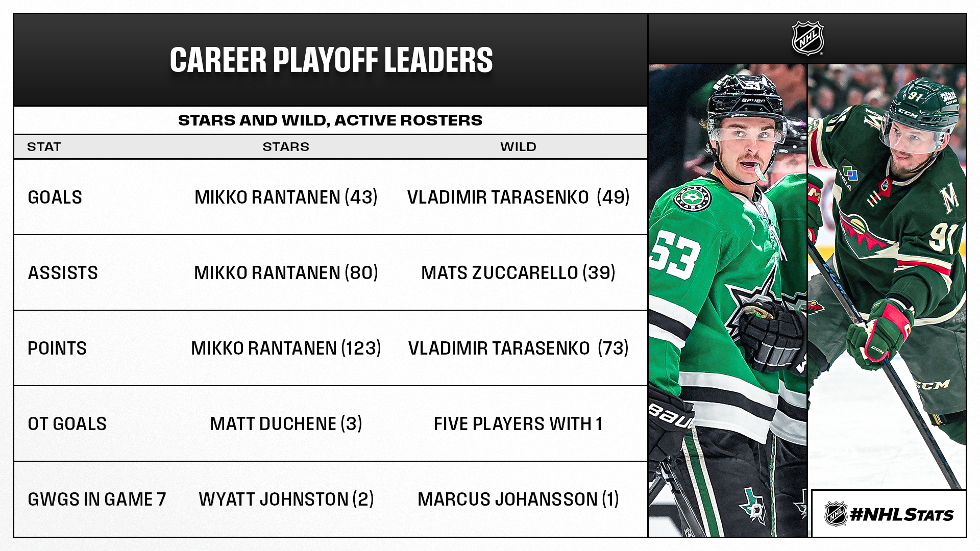 * The Stars and Wild will play their third head-to-head playoff series following six-game wins by Dallas during the 2023 and 2016 First Round. The most recent matchup was capped by Jake Oettinger (Lakeville, Minn.) ousting the Wild in his home state and Wyatt Johnston scoring the first of his three career series-clinching goals (also Game 7 of 2025 R1 & Game 7 of 2023 R2), which are tied with Al MacAdam and Mike Modano for the most in franchise history entering the playoffs.