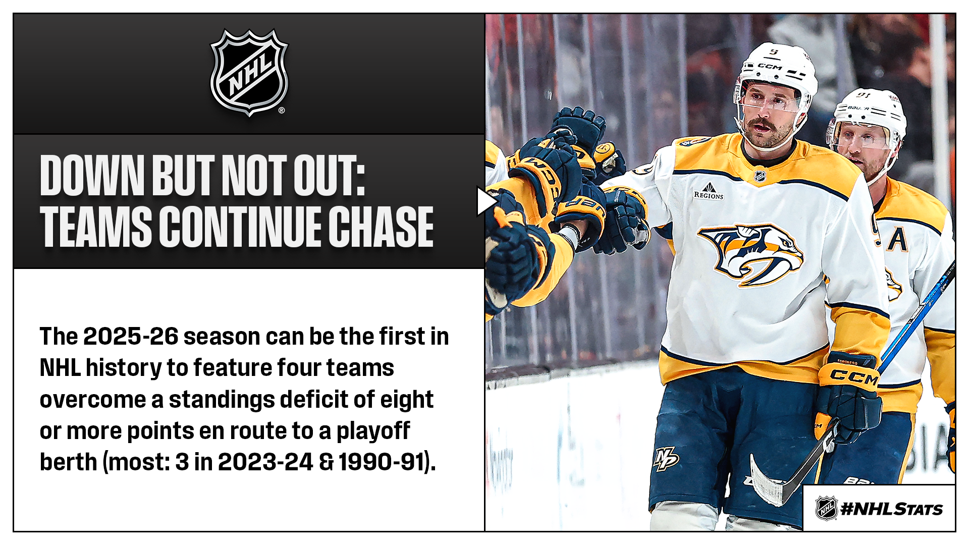 Filip Forsberg (1-0—1) scored one of his team’s five goals and Justus Annunen turned aside all 43 shots he faced – tied for the second most in a shutout win in franchise history – to help the Predators (37-31-10, 84 points) leapfrog the idle Kings (32-26-19, 83 points) for the final Wild Card position in the West. Nashville is looking to overcome a standings deficit of 11 points to make the postseason for the second time in franchise history (also 2020-21) and is one of several teams that have faced a sizable deficit this season that are still in the chase (also STL: 14, NSH: 11, WPG: 11, OTT: 10, CBJ: 9, WSH: 8) – Buffalo (8) has already clinched.