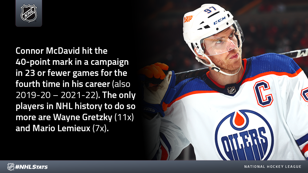 * Connor McDavid recorded his 12th multi-point game of the season – tied with Jason Robertson for the most among all players – while becoming the first skater to reach 40 points in 2022-23.