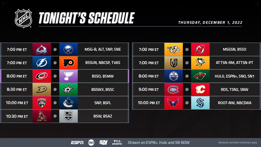 After a thrilling November, the calendar will flip to December where an 11-game Thursday is in store to kick off the month, including leaders of the Metropolitan, Central and Pacific Division all in action as the Devils (19-4-0, 38 points) welcome the Predators (10-9-2, 22 points), the Golden Knights (17-6-1, 35 points) visit the Penguins (11-8-4, 26 points) and the Stars (13-6-4, 30 points) host the Ducks (6-15-2, 14 points).
