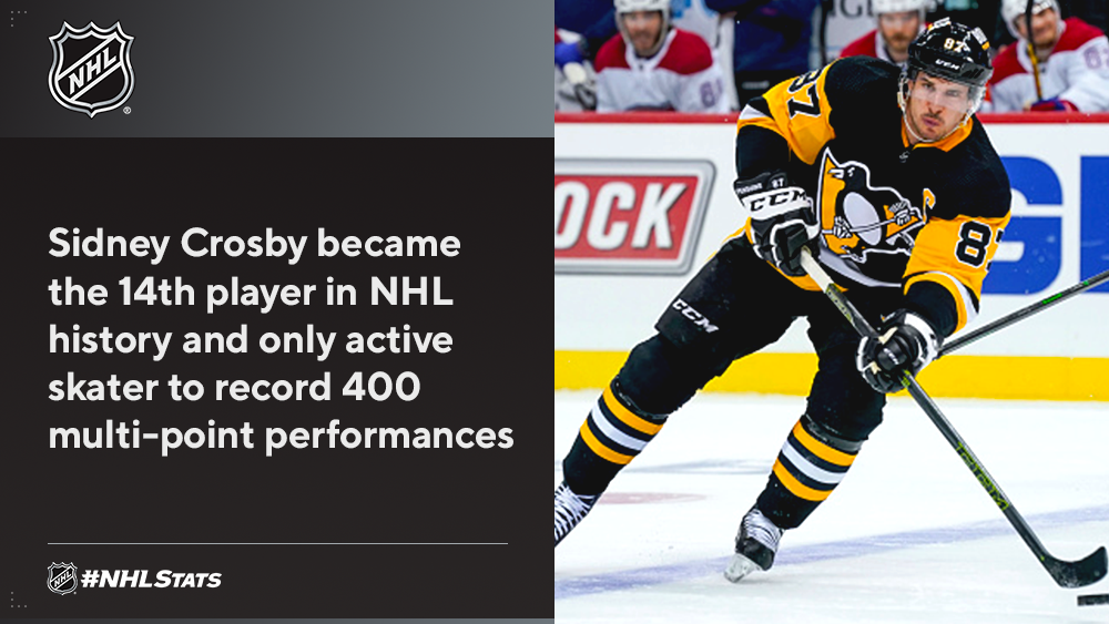 Sidney Crosby recorded his 400th career multi-point game, a benchmark no other active player has reached.* Auston Matthews joined Dave Keon as the only players to start their NHL career with the Maple Leafs and score 20 goals in each of their first six seasons with the franchise.