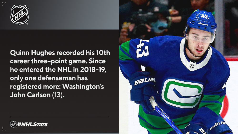 Quinn Hughes (0-3—3) factored on three of four goals to register his ninth career game with three or more assists, tied with Dennis Kearns for the most by a defenseman in Canucks history.
