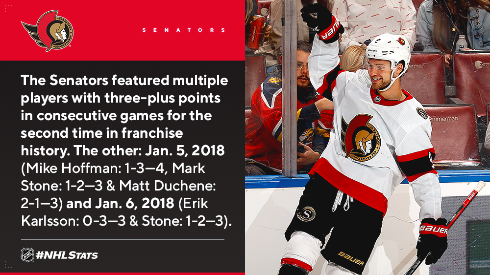 * After Brady Tkachuk (3-0—3) and Drake Batherson (0-3—3) each had three-point performances on Dec. 11, Batherson (1-3—4), Josh Norris (2-1—3) and Connor Brown (0-3—3) helped the Senators defeat the Panthers – one of three teams in the Atlantic Division with at least 40 points. Ottawa became the fourth team to score eight goals in a game this season and the first on the road.
