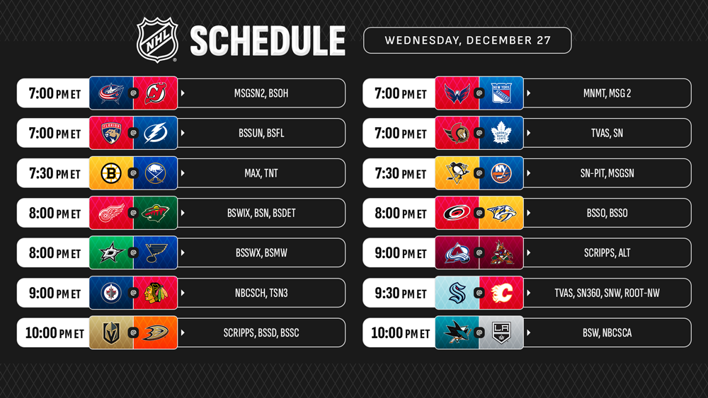 The NHL will now take a three-day holiday break before returning with another 14-game day on Wednesday, Dec. 27, including national broadcasts in Canada (Senators at Maple Leafs on Sportsnet & TVA Sports) and in the U.S. (Bruins at Sabres on TNT & Max).