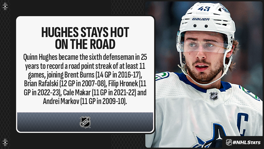 * Quinn Hughes scored one of four Canucks goals to extend his road point streak to 11 games and boost his 2023-24 totals to 9-25—34 (25 GP) as Vancouver defeated Calgary. His 34 points are tied with Cale Makar (7-27—34 in 23 GP) for the most by a defenseman through 25 games or fewer in a season in the past 30 years, trailing only John Carlson (36 in 2019-20).