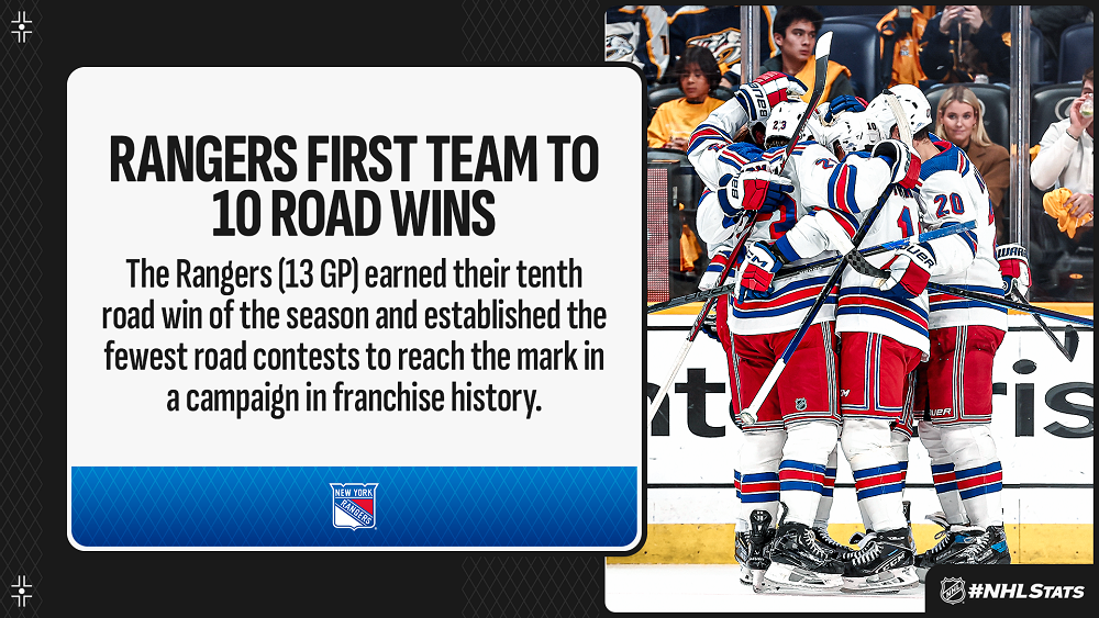 * Vincent Trocheck (1-2—3) and Adam Fox (0-3—3) both put up three-point performances as the Rangers rallied from a two-goal deficit to earn their NHL-leading 10th road win of the season.