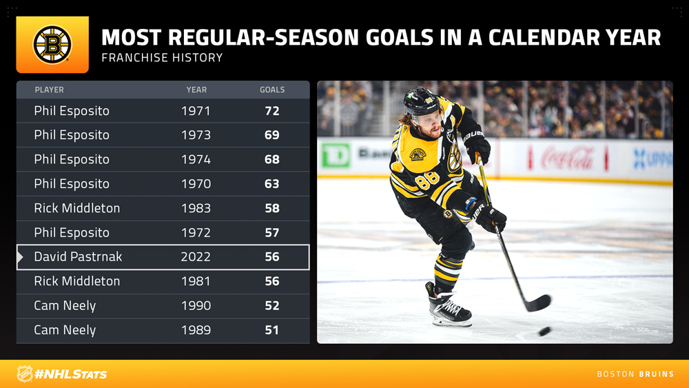* The Bruins return to TD Garden after a three-game road trip – an arena which has witnessed the team collect at least one point in their past 20 outings (18-0-2) as well as David Pastrnak finding the score sheet in each of his past seven home contests (6-4—10 in 7 GP since Dec. 3). Pastrnak already has 56 regular-season goals in 2022 and should he score again, he would tie Phil Esposito (57 in 1972) for the sixth most in a calendar year by a Boston skater.