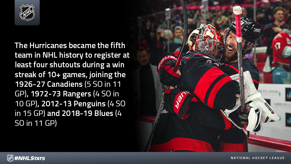 * The Hurricanes benefited from another shutout performance to push their win streak to a franchise-record 10 games while also extending their point streak to 16 contests.