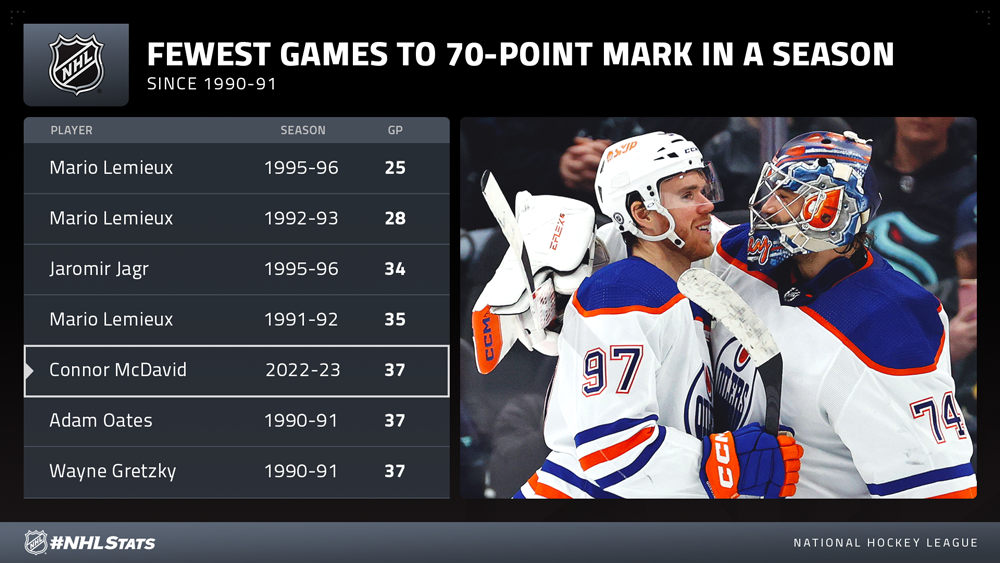 * The 2022-23 campaign is the second season McDavid has collected 40 assists in 37 games or fewer following 2020-21 (35 GP). He is one of only two active players to accomplish the feat multiple times joining Sidney Crosby (34 GP in 2006-07 & 35 GP in 2012-13).